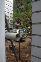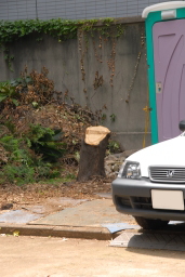 建物の4Fほどの高さに成長していたケヤキの木の切り株だけが残っていました。