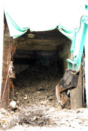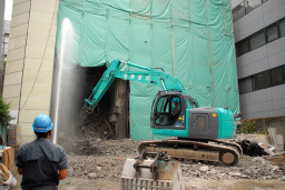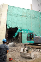 解体した廃材の塵が舞わないように水を掛けながら作業が進められていました。