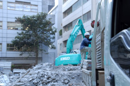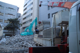 この日は解体作業と並行して、建物の周囲を覆っていた外壁パネルや足場の撤去作業も行なわれていました。