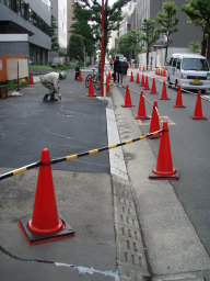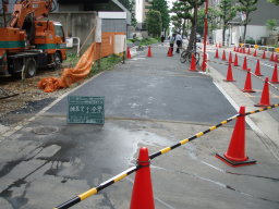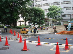 前日の街路樹を撤去した後の舗装工事が行われました。左の写真は昨日の作業後に仮の舗装を施した状態のものです