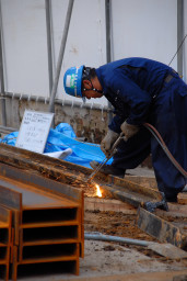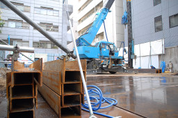 | H型鋼を打ち込む際、よりスムーズに作業を進めるために、打ち込む先端を斜めにカットする作業も行われていました。 こうすることによって、硬い岩のようなものが地中にあっても、ある程度のものであれば砕くことが出来るため効率が上がるのだそうです。 さすが、匠の業ですね。 |