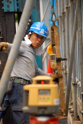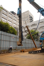 | 慎重にH型鋼を地中に打ち込んでいきます。 | |