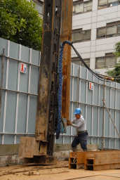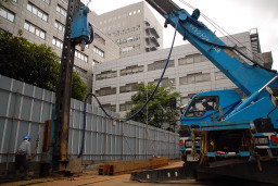 | 今回の作業はサイレントジャッキ工法という工法で行われました。かつては正にカーン、カーンというものすごい音を立てて打ち込む工法が主流でしたが、都会のど真ん中で、しかも病院のすぐ脇でそのような騒音を出す訳にはいかないということで、このような非常に静かでほとんど振動もしない工法で行われました。 | |