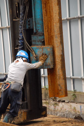 | 打ち込みの最終段階になると、既に打ち込まれているH型鋼との頭を揃える必要があるため、特殊な機材を使用して慎重に作業が行われていました。 | |