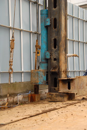 | 水色の機械がH型鋼を挟み、そのまま下へ垂直移動することによって打ち込んでいきます。 | |