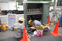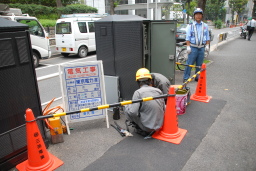 | ちょうど三楽病院の前の歩道の辺りに、黒く大きな鉄の箱がありますが、その中に電気に関する機械が詰まっているようです。 | |