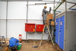 | この日は先週設置した分電盤に通電するための作業が行われました。 | |
