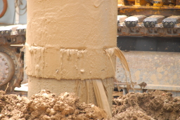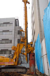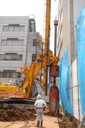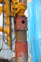 | 茶色いドラム缶のような円筒状のものの上部分が回転し、地中に埋まっている基礎部分を、なんと3時間もかけてくりぬいていきます。 | |