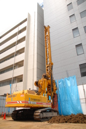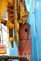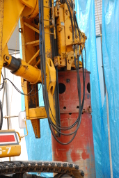 | 上の写真と見比べると、円筒状の上部分が回転しているのがお分かりになられると思います。 さすがに地中数10メートルにある基礎を解体するので、辺りにはちょっとした轟音と震度1〜3ぐらいの震動(半径5m内)がありました。 |