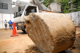 | くり抜かれた基礎部分のコンクリートの塊はパワーシャベルで移動します。 | |