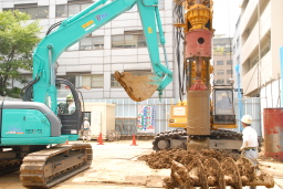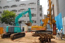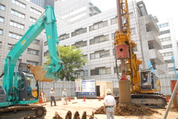 | こちらが、つい先ほどくり抜かれた基礎部分。地中には広い範囲でこのようなコンクリートの壁(基礎部分)が埋まっているのですが、その全部を取り除くのは不可能なため、今回基礎を打ち込む部分のみをこのように円筒状にくり抜いています。 | |
