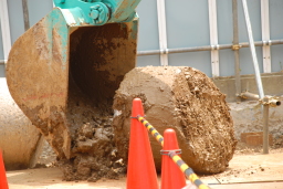 | くり抜いた基礎部分が出てくるところ。 筒状のものから泥水が噴き出ているのが分かります。 |