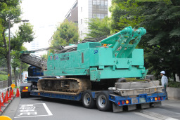 | 続いて杭打ち機のアームや様々な資材を積んだ大型トレーラーが到着しました。 | |