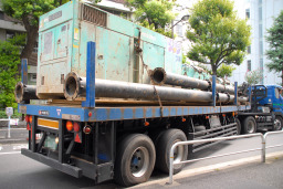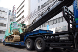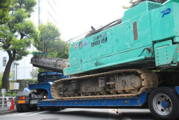 | 杭打ち機本体の搬入が終わると、続いてパワーショベルと杭打ち機に取り付けるアームの一部を積んだ大型トラックがやって来ました。 | |