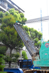 | 杭打ち機のアームが街路樹を傷つけないよう、時折アームを上げたり微妙に旋回させながらの搬入でした。 | |