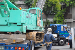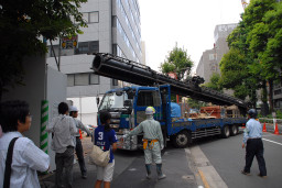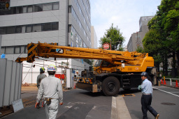 | 鉄板の移動が終わって間もなく、ラフター(移動式クレーン)が到着しました。 | |