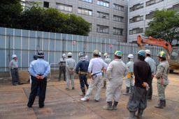 | 時刻は8:00を回り、現場関係者が一堂に会し、朝のラジオ体操と朝礼が行われました。 | |
