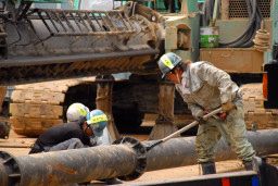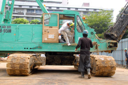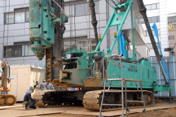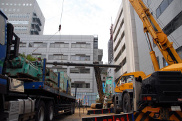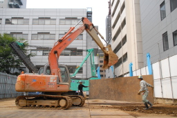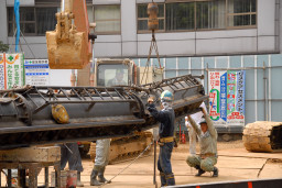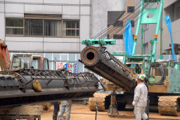 | こちらはパワーショベルを使って杭を打つ場所の鉄板を取り外し、別な場所に移動しています。 | |