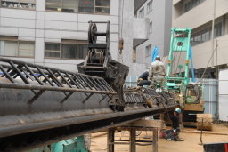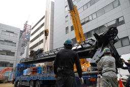 | 時刻も7:00を回り、いよいよ杭打ち機を降ろす作業が始まりました。時折「キーン」という金属音を立てながら、ゆっくりと慎重に降ろされていきました。 | |