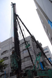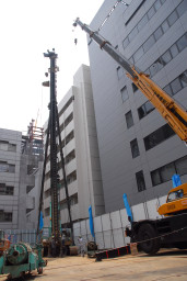 | ついに杭打ち機が起き上がりました。ものすごい高さに圧倒されます。 |