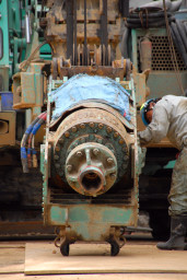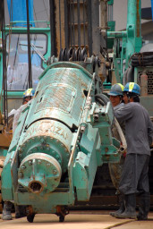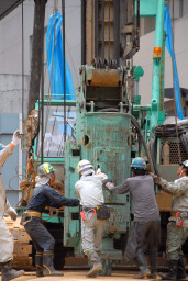 | これらの機材は全て人の力で固定されていきます。これから約1ヶ月を掛けて杭打ちが行われるわけですが、それだけに慎重且つ正確に準備がなされていました。 | |