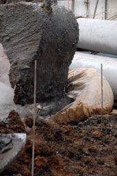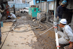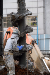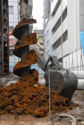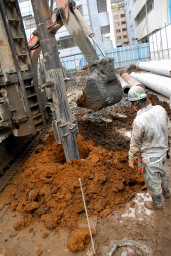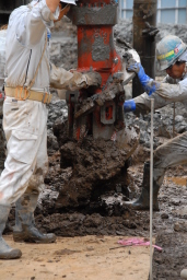 | こちらは掘削の最終段階。掘削用のドリルには地質改良剤を含んだ泥が付いており、それをシャベルや木片で取り除いているところ。 | |