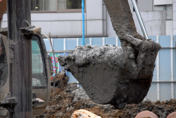 | 掘削で掘り出された泥に改良剤を入れ、パワーシャベルでよくかき混ぜてからプールへと移動します。こちらはその改良剤と混ぜられた泥をプールへ運び出すところ。 | |