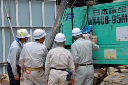 | 杭打ち機のオペレーターに手振りで指示を与えながらの慎重な作業でした。 | |