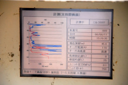 | こちらがそのモニター。 掘削の際にはただ掘るだけではなく、微弱な電流を流すことによってその地質の硬度も計っています。 こちらのモニターで、赤いラインは事前に計測した地質調査での数値。青いラインが実際に掘削して出てきた数値。 グラフの縦軸は深さ、横軸はその地質の固さを示しています。このグラフからは事前の調査よりも実際には硬くしっかりした地質であることが示されています。 |