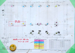| こちらは、杭打ちの進行状況を示した図面。既に6本の杭打ちが終了し、現在は7本目の掘削に取り掛かっています。 | |