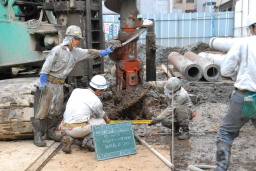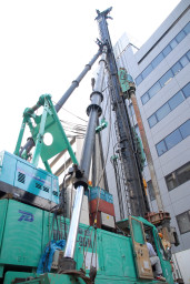 | 杭芯が定まると、いよいよ掘削を開始します。最初の掘り始めの段階で杭芯がずれてしまわないよう職人さんたちが支えながら慎重にドリルを回しています。 | |