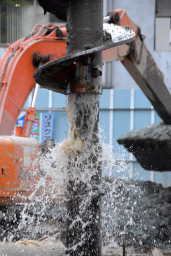 | 掘削が終わり、ドリルの切り離しをしているところ。掘削の際にはドリルの中に水を流しながら掘り進んでいくため、その水が勢いよく溢れ出しているのが分かります。 | |