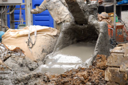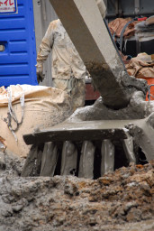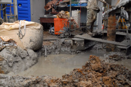 | 杭打ちの際に放出されるセメントを含んだ水が大量に杭打ちのすぐ脇に掘られた穴に溜まっていました。。 | |
