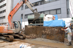 | 当初の予定よりもやや早いペースで作業が進んでいます。 この日は通りに面した入口付近の杭打ちが行われていました。 |