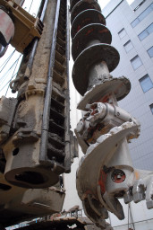 | 杭打ちの最終段階。杭打ち機がしっかりと杭をグリップし、回転させながらゆっくりと打ち込んでいます。 | |