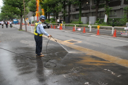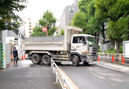 | 何台ものダンプが出入りするため、入口付近にこぼれ落ちた土砂を警備員さんが何度も水で洗い流していました。 |