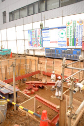 | 現場に足を踏み入れると、先週までとは状況が一変していました。 敷地のあちこちで地下部分の掘削作業が行われ、鉄骨が組まれていました。 ここは入口付近の機械式駐車場が設置される部分。 |