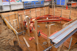 | 6月に行われた山留めの作業で打ち込まれたH型鋼に、何枚もの板が積み重ねられ土留めをしています。 | |