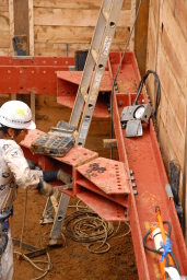 | 地下部分を掘削する上でこの土留めを行わないと、圧力で周辺の土砂が崩れ、隣接する建物に影響を及ぼす危険があるため、この板の一枚一枚が非常に重要な役割を果たしています。 | |