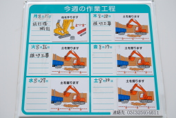 | 工事現場の通りに面して設置されている今週の予定表。しばらくは、この根切工事が行われるようです。 | |