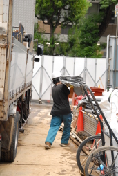 | 明日からハンドブレーカー(よく工事現場で見かける「ガガガガー」という轟音を立てながらコンクリートなどを砕く機械)による既存躯体の撤去作業が行われるため、その騒音対策用に防音シートが到着したところ。 | |