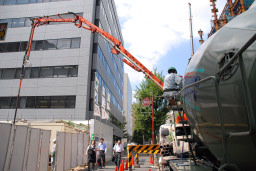 この日は掘削した地下部分にコンクリートを流し込む作業が行われました。 |
