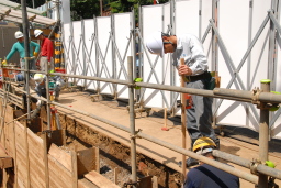 | こちらは、今後建設車両などが乗り入れる構台のための土台となる部分にコンクリートを流し込んでいるとこと。 |