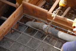 | このようにミキサー車からコンクリートを出し、それを長いホースを伝わせて流し込みます。 | |
