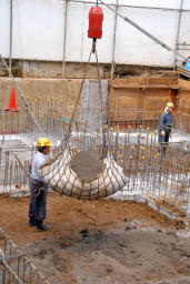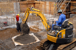 | 埋め戻し作業とは言っても四方を梁で囲まれているため、埋め戻しに使用する土は地道にクレーンで運んでいました。 | |