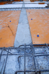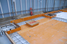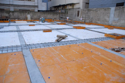 | 手前のオレンジ色のものはいわゆるコンクリートの型枠。その奥側の白いものは、このオレンジの型枠の上に設置された断熱効果もあるポリウレタン状のもの。 | |