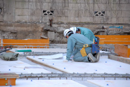 | この週は1階の床部分にコンクリートを流し込む前の型枠を設置する作業が行われて来ましたが、この日はその最終段階の作業が行われていました。 | |