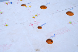 | ポリウレタン状の白いボードの上には様々な印が書かれていました。丸くくり抜かれている部分は各種ライフラインの配管が通る所です。 | |