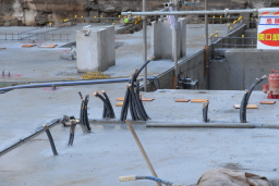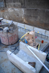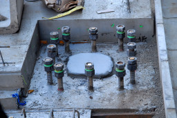 | 左の写真は建物を支える柱が取り付けられる部分。この下に約50mの杭が打ち込まれています。 柱は奇しくも12本の太い鉄筋で固定されます。12という数字は聖書の中で「完全数」と呼ばれていますが、まるで「この下にはそれだけしっかりとした強固な土台が据えられているんですよ!」ということを表しているかのようにも見えます。 |