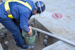 | 左の写真は杭打ちをした溝に溜まった水を大きなスポンジに含ませ、バケツの中で搾っているところ。 このように浅い部分ではポンプが使えないため警備員さん自ら地道に作業しておられました。 本当にどうもありがとうございます。 |